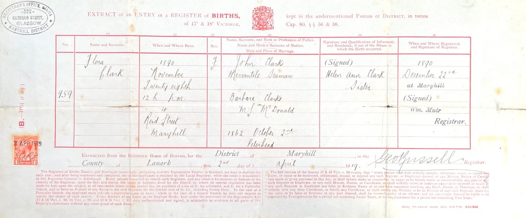 As father was from Portsmouth, he never met any of his mother’s Scottish relatives, or even knew of their existence, so to say he was stunned when my research revealed that Flora was the youngest in a family of 12 children would be an understatement !