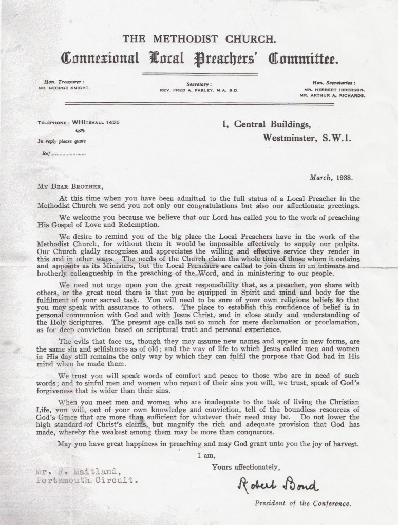 A Local Preacher is a layperson who has been accredited by the Methodist Church to lead worship, conduct pastoral duties and establish a strong presence in their local community. I don’t know what my grandfather’s motivation was, but during the early part of the 20th century it was not uncommon for skilled working class men to be drawn to taking on this role as it was one of the few ways in which they could acquire an education and the status of a leader within their community.