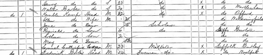 For example, my great grandparents, Samuel Cullingford and Esther Page, were married in Wantisden on 29 July 1890 but when the 1891 census was taken a few months later, Esther is living with her in-laws in nearby Butley and there is no sign of Samuel. Thanks to his distinctive surname and birthplace, it proved relatively easy to track him down, and I discovered that he was a so-called “Suffolk Jim” working as a maltster 150 miles away in Burton-on-Trent, Staffordshire.