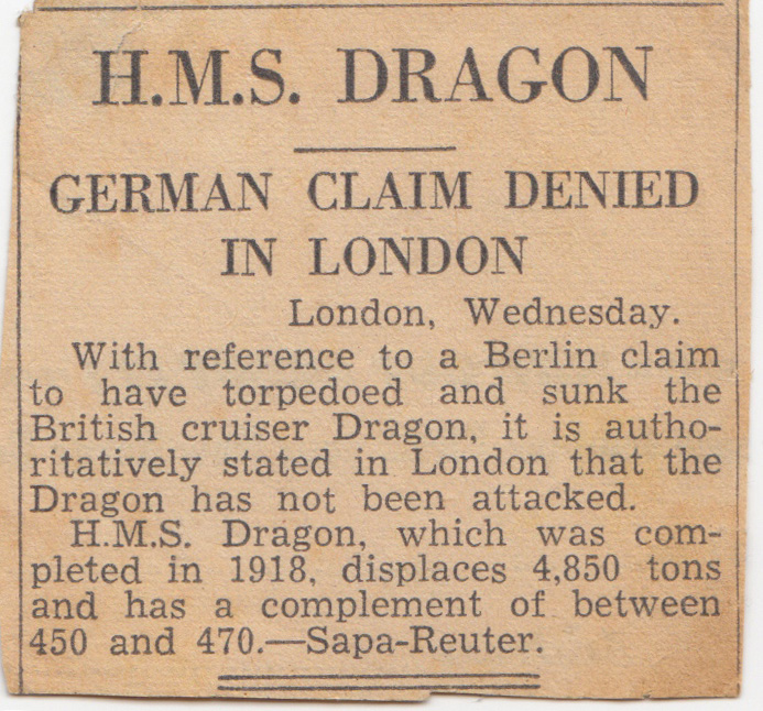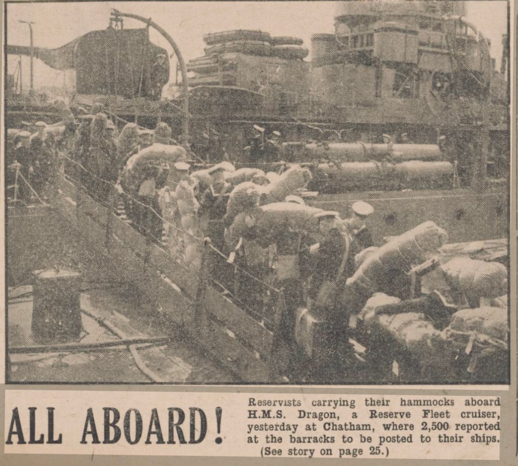 When war was again declared on 1 September 1939, my grandfather had just joined HMS Dragon, a light cruiser dating from 1917 which he had previously served on in the 1920s. The newspaper article below is dated the same day as Jack joined the ship, so it seems that initially he was engaged in training the reservists as a member of the skeleton crew. In all 12,000 civilian sailors had been called up for training and to ready ships from the Reserve Fleet for active service.