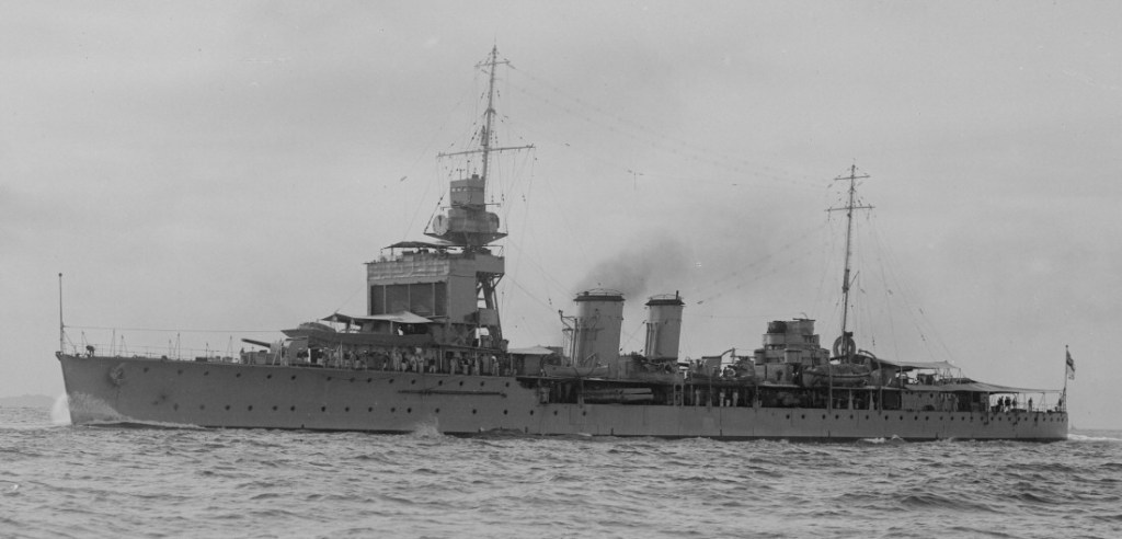 It seems very wrong to gloss over the next 20 years of my grandfather’s service, but time and the theme for this post means that reluctantly I must do so. His shore base was HMS Pembroke in Chatham, where he was stationed between the overseas voyages that lasted up to two and a half years. Much of his early inter-war service was spent aboard ships that were part of the Mediterranean Fleet, but his time on HMS Cumberland took him to the China Station, which had been established to protect British interests in the Indian and Pacific Oceans. During this time, he had a range of roles including acting as the ships’ diver, who was responsible for checking the hull for mines, and operating the catapult used to launch spotter planes.