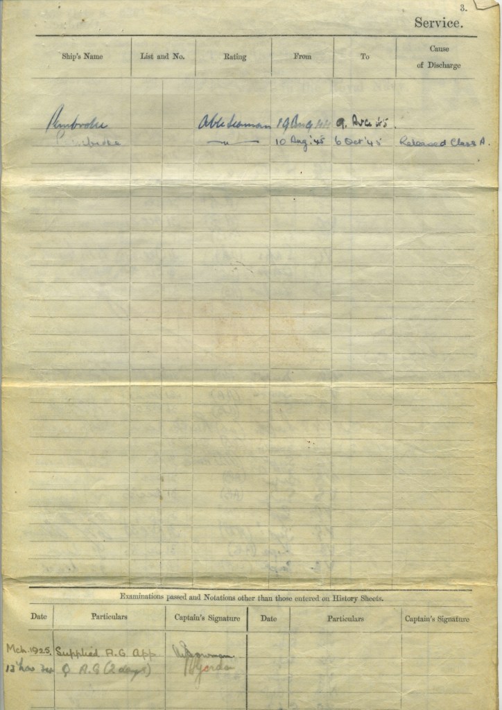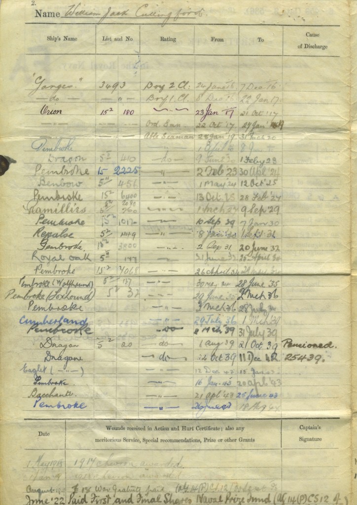 Extract from the Royal Navy Service Record for William Jack Cullingford